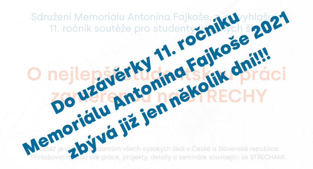 Do uzávěrky 11. ročníku Memoriálu Antonína Fajkoše 2021 zbývá poslední týden!!! Nezapomeňte přihlásit své studentské práce na téma STŘECHY! Příjem přihlášek končí už 15. 11. 2021!!! Všechny potřebné informace naleznete na této stránce. Týden před […]